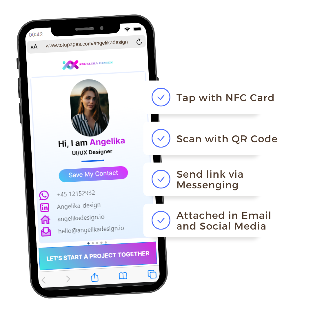 A great conversation starter, tap our card on NFC enabled phone or scan the QR code to access your contact profile page and share your contact easily.